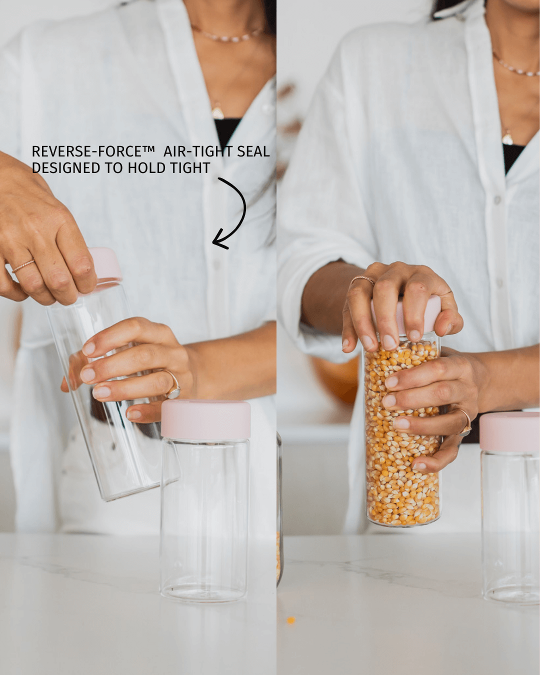 Elevate your kitchen storage with our sleek, sustainable Glass Pantry Storage Containers. Tall and space-saving, they’re perfect for dry goods and fresh ingredients alike. Featuring our patented Reverse-Force™ Lid, each container seals in freshness and flavour to keep your food at its best.